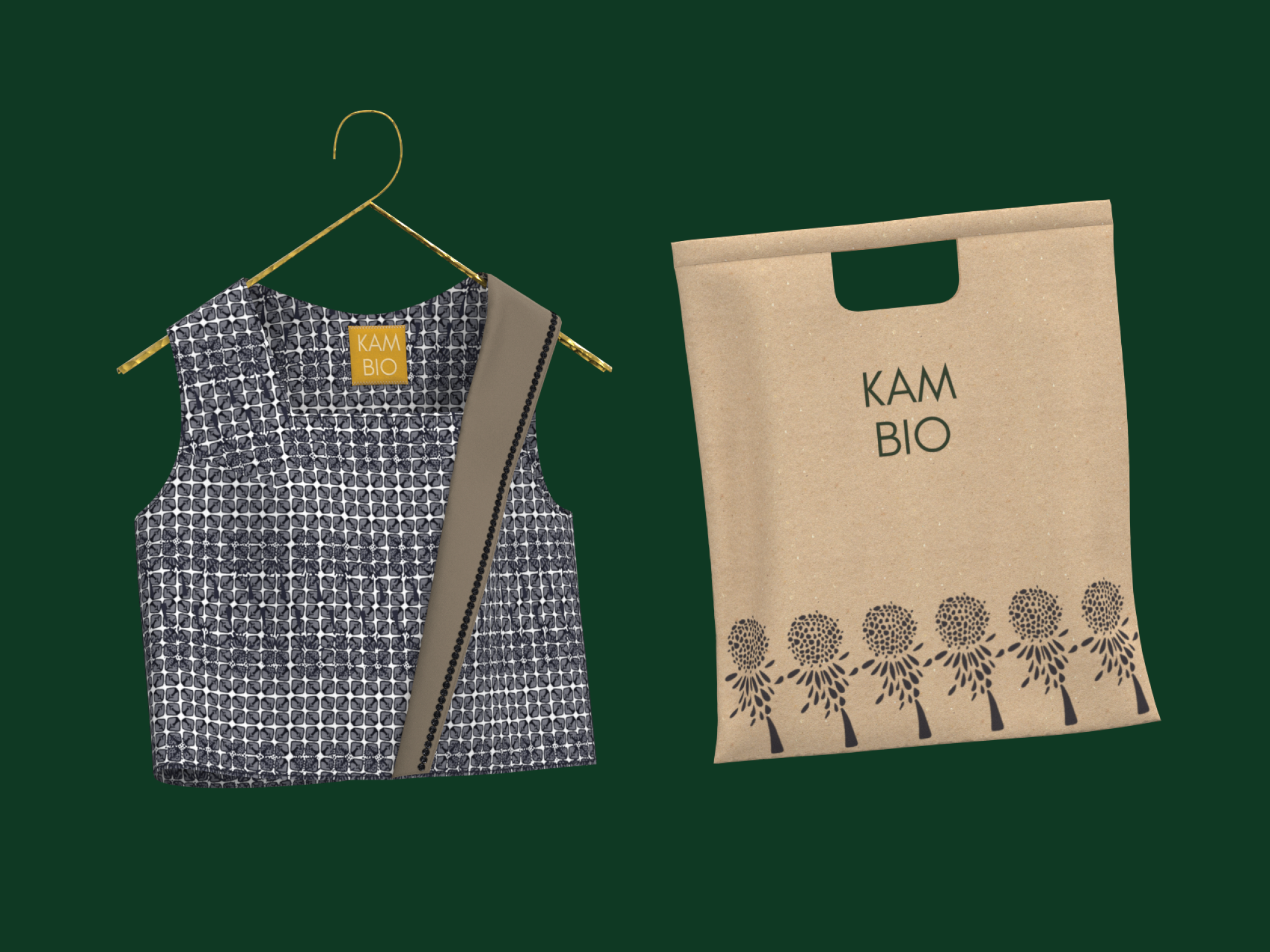 I developed branding elements for the Kambio line, which included clothing tags and a custom shopping bag. Additionally, I rendered a short animation featuring a digital model walking in one of the final looks, bringing the collection to life.